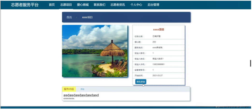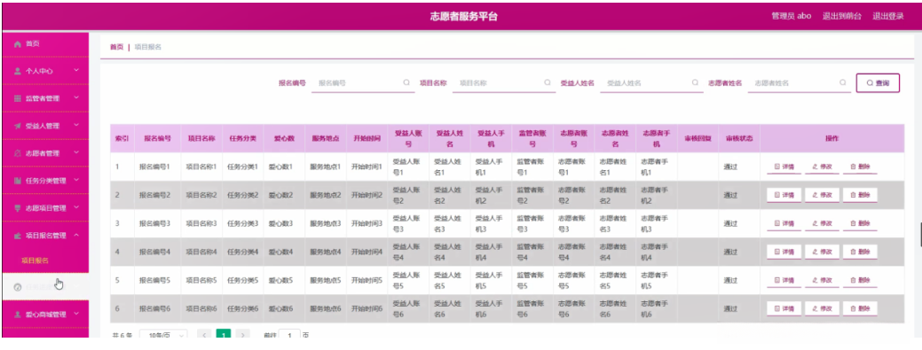 在项目报名管理页面中可对索引、报名编号、项目名称、任务分类、爱心数、服务地点、开始时间、受益人账号等基本信息以及目标人群信息(受益人账号)、服务地点信息(监管者账号)、服务参与者的详细信息(志愿者账号)等核心信息进行详细信息查看与操作(增删功能),如图5-7所示。