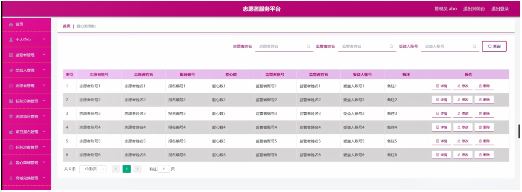 爱心数量增加管理相关内容,在爱心数量增加管理的相关页面中支持查看包含索引(编号)、志愿者账号(账号)、志愿者姓名(姓名)、报名编号(编号)、爱心数量(数量)、监管者账号(账号)、监管者姓名(姓名)、受益人账号(账号)等信息的具体数据,并提供修改或删除功能。