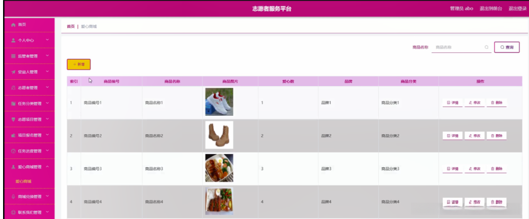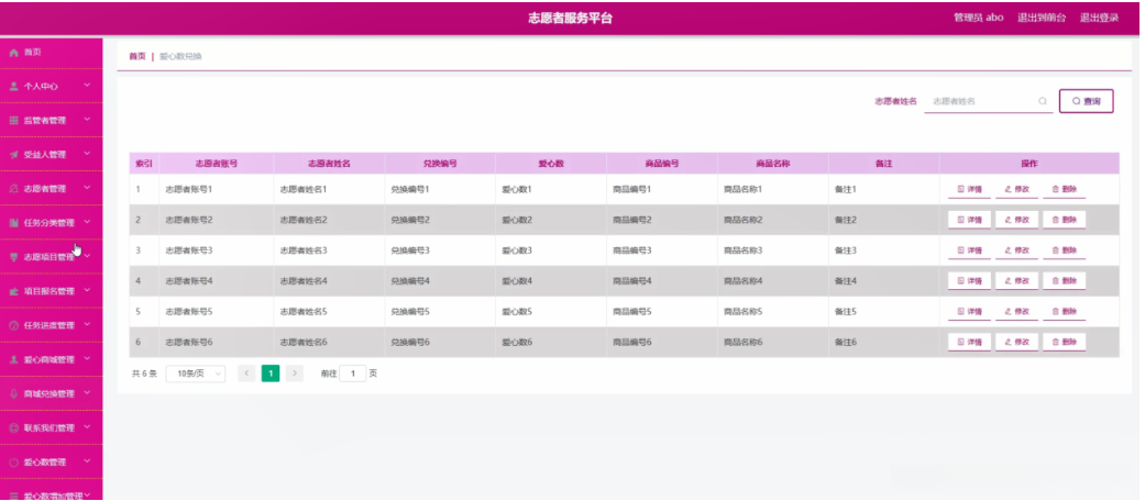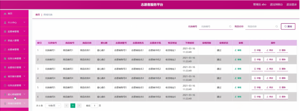商城兑换管理模块,在兑换管理模块中的兑换页面中可以对条号、兑换码、商品名称信息、商品名称详尽描述、爱心积分值、志愿者账号信息(包含账号ID及密码)、志愿者姓名详细记录以及志愿者联系电话等关键数据进行显示与编辑功能操作;包括详细信息查看(详情)、数据更新(修改)以及数据删除等功能选项;如图5-10所示的兑换页面中