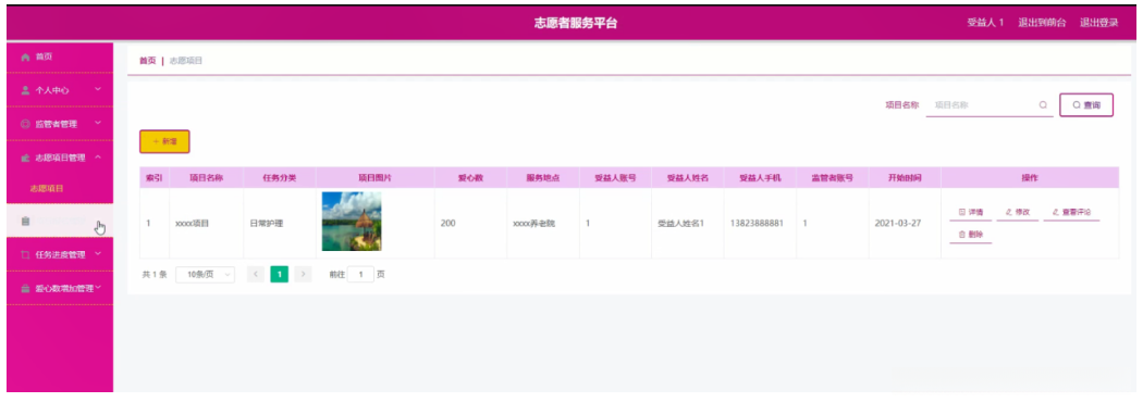 志愿服务项目管理在志愿项目管理页面中提供了一套完整的功能模块可供使用。具体信息包括:项目的索引编号(Index)、名称(Name)、任务分类(Category)、配图(Image)、爱心数量(Heart Count)、服务地点(Service Location)、受益人账号(Beneficiary Account)、姓名(Name)、联系电话(Phone Number)、监管者账号(Supervisor Account)以及启动时间(Start Time)。管理员可通过该页面实现以下功能:详细信息展示(Detail)、内容修改(Update)以及用户评论查看(Comment)或永久删除/Delete功能。