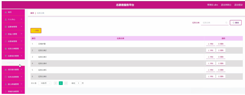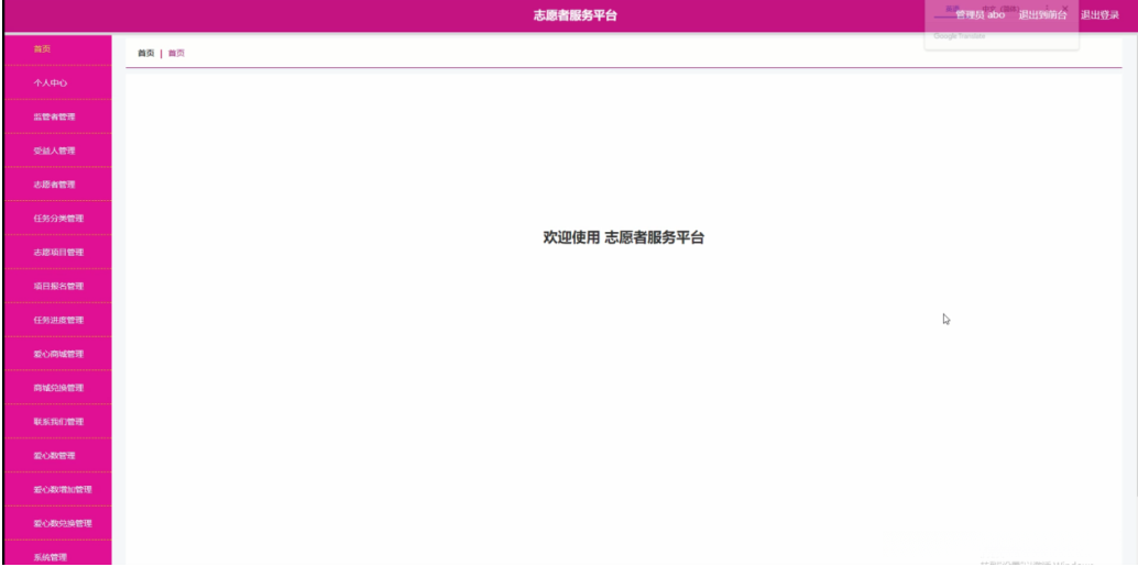 管理员登录进入志愿者服务平台后即可全面查看各类信息,并可对其执行相关操作(如图5-6所示)。平台提供了以下功能模块:首页、个人中心、监管者信息管理、受益人信息管理、志愿者活动管理、任务分类管理、志愿项目管理、项目报名系统、任务进度监控系统、爱心商城系统及相关的功能项:爱心积分变更操作、爱心积分兑换操作等,并支持系统整体配置设置
