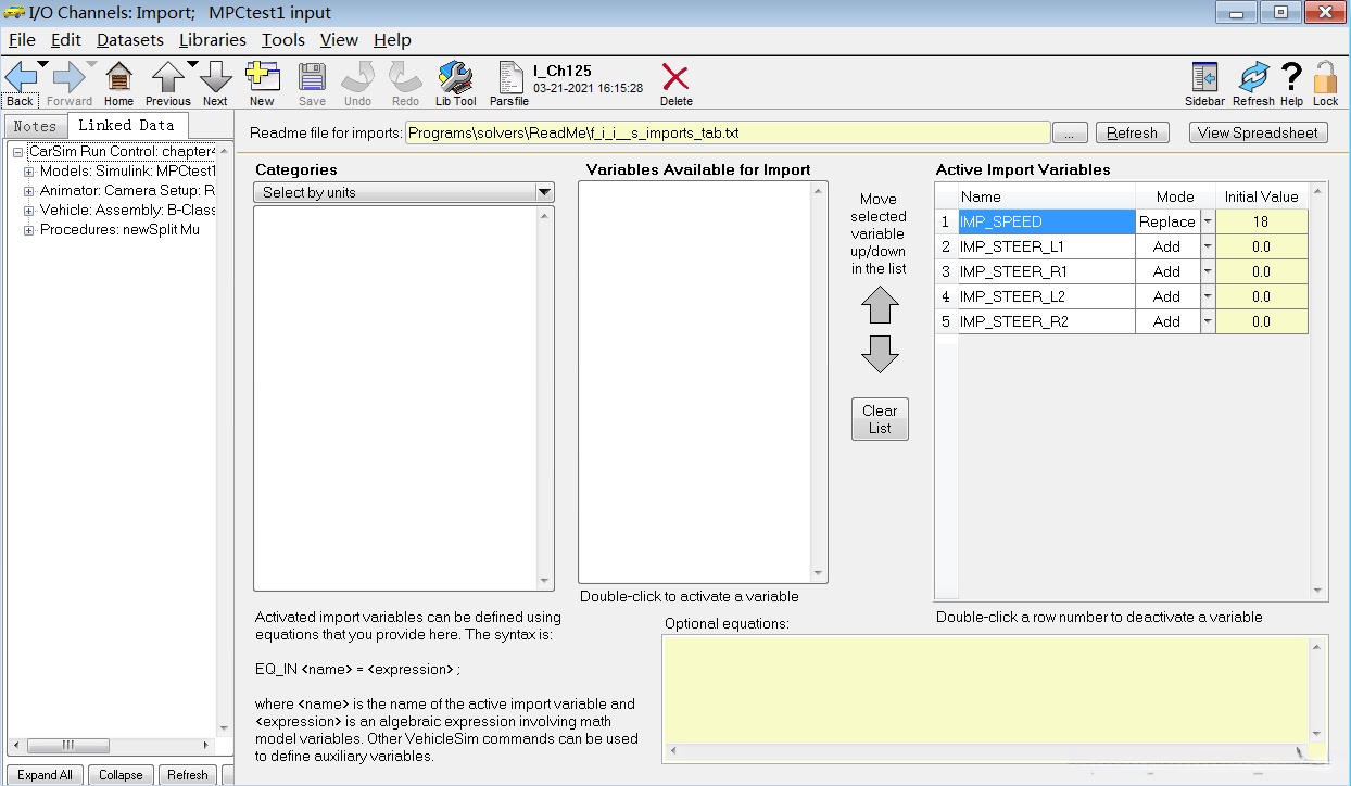 输入变量依次包括质心速度(以km/h为单位)、左前轮转向角度、右前轮转向角度、左后轮转向角度以及右后轮转向角度。请注意此处变量顺序不可随意更改;这是因为这些输入变量与Simulink中的控制器输出变量存在一一对应的关系。在Carsim软件中,默认情况下定义的角度采用度数表示(°),而速度参数则以千米每小时(km/h)为单位。因此,在设计MPC控制器时若未统一这些参数的计量单位,则需进行相应的转换。