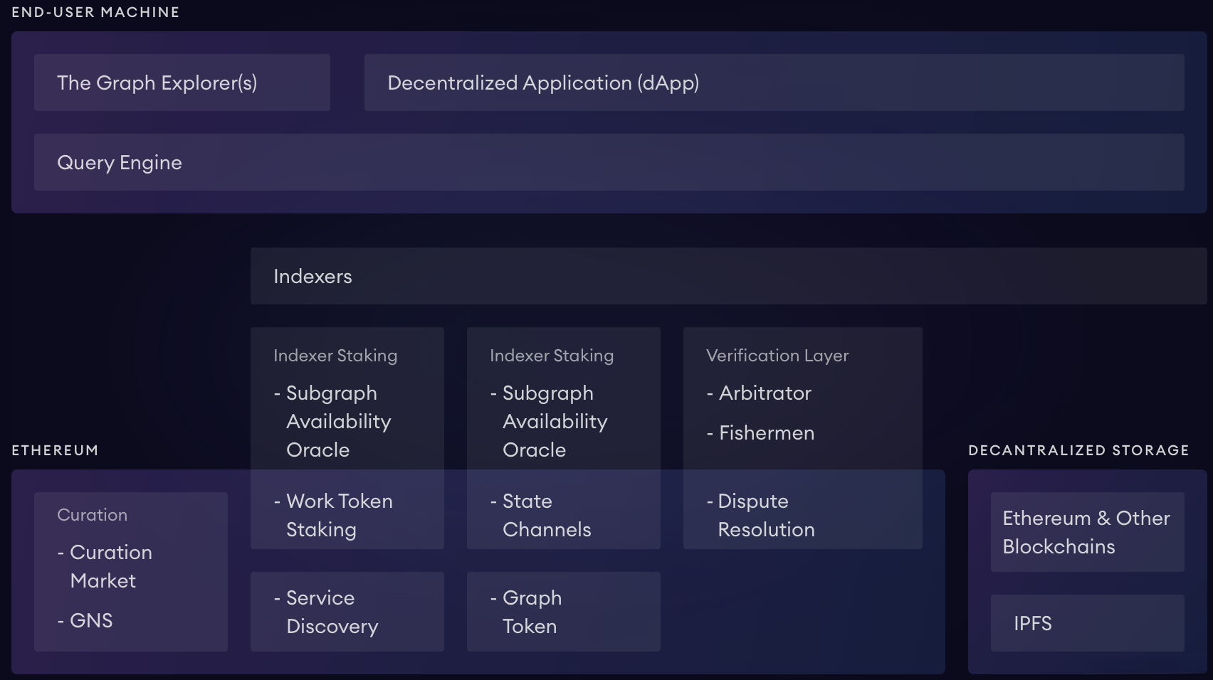 The Graph网络包含以太坊上的智能合约,以及链下运行的各种其他服务和客户端。