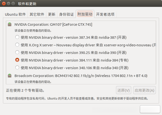 选择适合自己电脑版本的显卡驱动进行应用更改。 我选择的是nvidia-384.