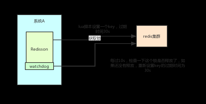 redisson中有一个watchdog的概念,翻译过来就是看门狗,它会在你获取锁之后,每隔10秒帮你把key的超时时间设为30s