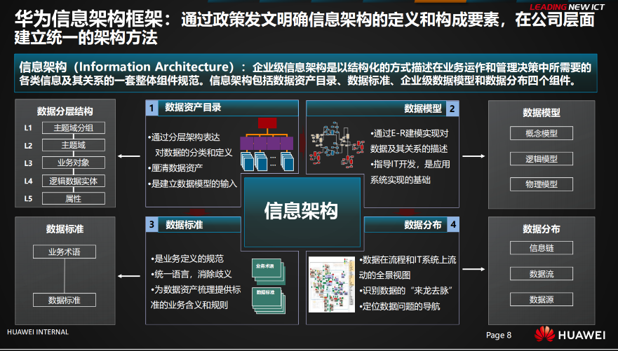 在数字化转型过程中对信息架构建设具有重要意义的企业需将信息架构设计与自身业务需求及发展战略紧密结合 该信息架构涵盖数据组件 应用组件 技术组件及管理组件四个关键组成部分 通过实施数字化的业务对象 过程与规则构建 在企业中实现业务流程优化与效率提升的目标得以达成
