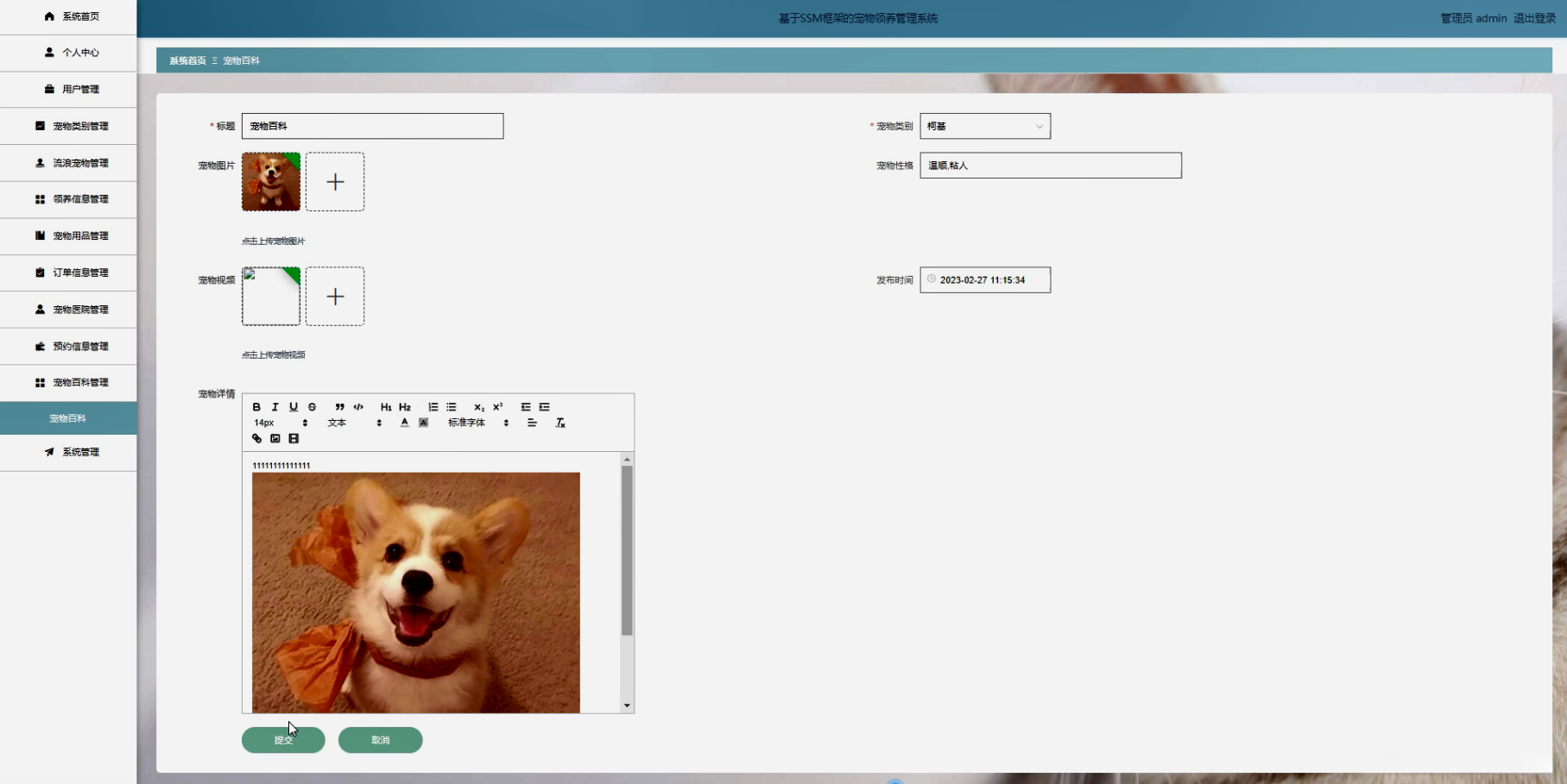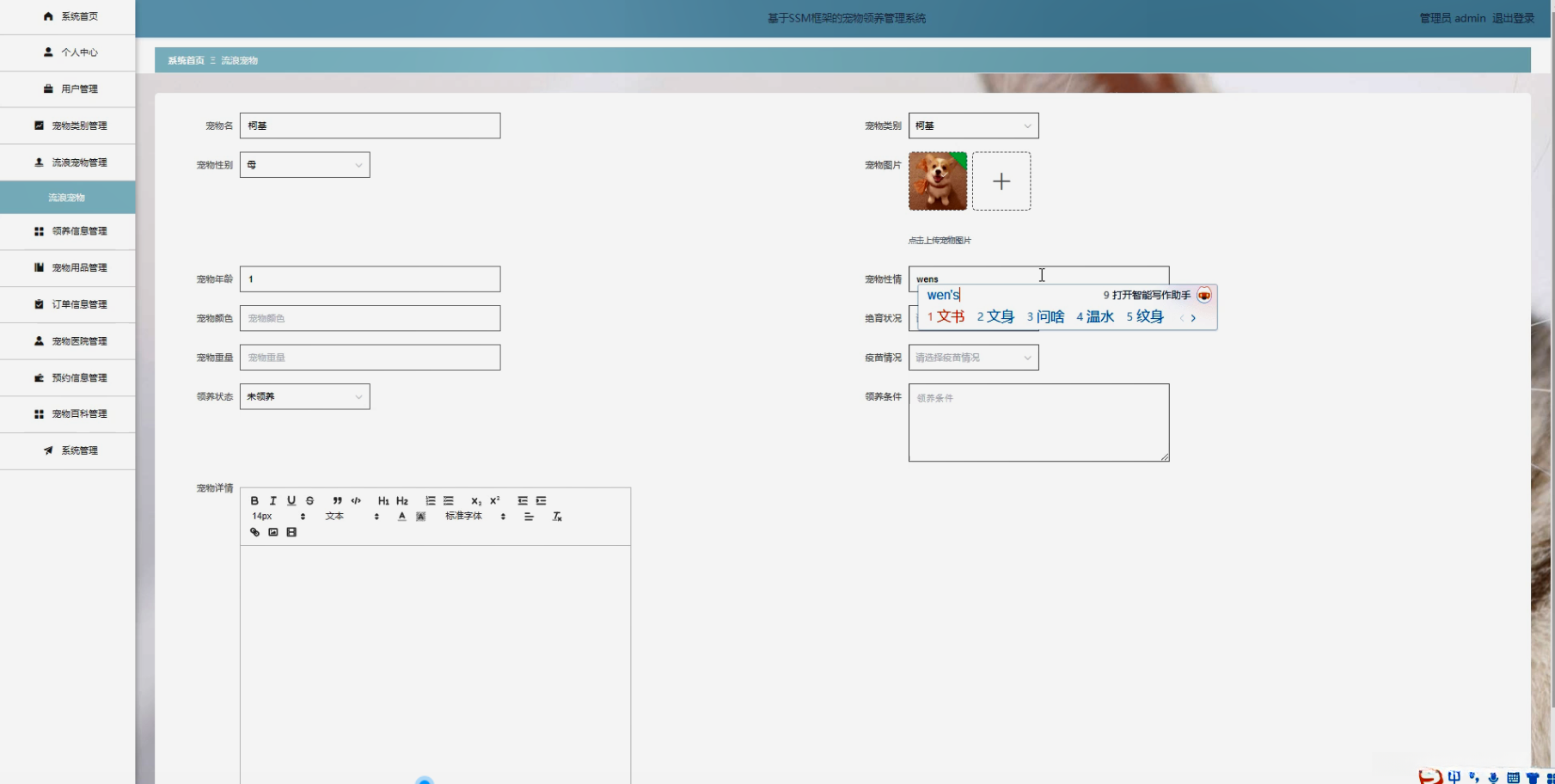 流浪宠物信息管理:录入可领养宠物档案,并收集其完整资料以便查询。