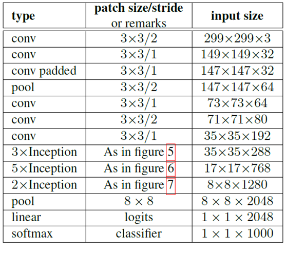 注 :上表中的Figure 5 指没有进化的Inception,Figure 6 是指小卷积版的Inception(用3x3卷积核代替5x5卷积核),Figure 7 是指不对称版的Inception(用1xn、nx1卷积核代替nxn卷积核)。