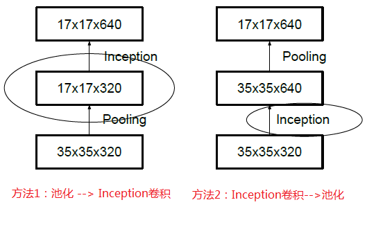 先池化再作Inception卷积,或者先作Inception卷积再作池化 。但是方法一(左图)先作pooling(池化)会导致特征表示遇到瓶颈(特征缺失),方法二(右图)是正常的缩小,但计算量很大。为了同时保持特征表示且降低计算量,将网络结构改为下图,使用两个并行化的模块来降低计算量(卷积、池化并行执行,再进行合并)