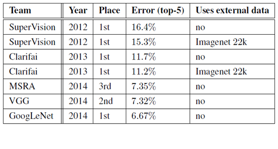 从GoogLeNet的实验结果来看,效果很明显,差错率比MSRA、VGG等模型都要低,对比结果如下表所示: