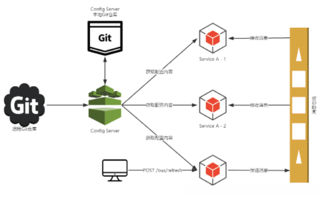 这里引用 程序猿DD 画的一张图片,Spring Cloud Config 配合 Bus 完成所有节点配置的刷新来描述之前的实例(本文实例不是刷新,而是新增配置,但是流程是一样的):