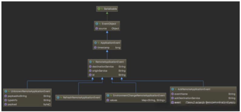 Map<String, String>类型的数据并更新到 Spring 上下文中Environment中的事件。文中的实例就是使用这个事件并配合EnvironmentBusEndpoint和EnvironmentChangeListener完成的。 - AckRemoteApplicationEvent: 远程确认事件。Bus 内部成功接收到远程事件后会发送回