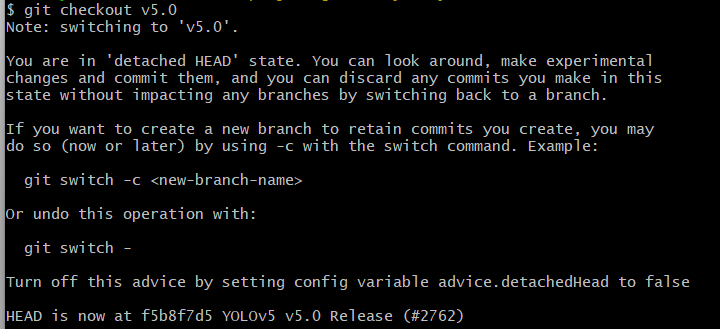 我们可以看到master的前面带着一个*,这说明我们现在克隆的仓库并不是我们要的yolov5(v5.0)版本的,我们可以大致对比一下下载的文件和我们在github上的yolov5的v5.0的版本的文件是否一致,很明显不一致的。我们可以在终端输入: