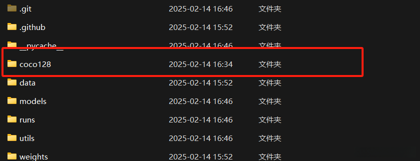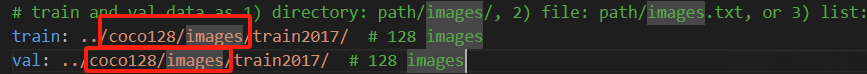 我们看到上面训练路径是../coco128/images/train2017/,这个配置默认我们新创建的数据集文件夹的命名为coco128。