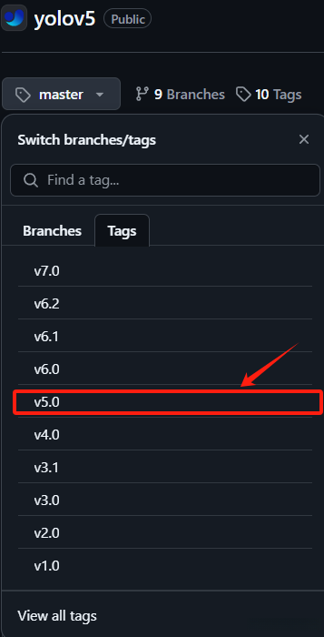 因为我们之前已经在github中看到ultralytics/yolov5这个项目了,然后v5.0的版本是在tags这个标签里,所以我们就使用了git tag来查看这个仓库里面的所有标签。