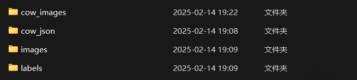 下面是cow_detect的文件分布,其中cow_images里面的图片是不参与训练和测试的,是我们最后用运行python detect.py时,要用到图片检测来源;cow_json的json形式的图像标记,用不到。