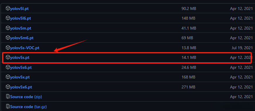 点击之后,出现这些模型,选择yolov5s.pt下载,然后将下载好的模型放到我们自己的yolov5的目录下,(先将之前在github上下载的yolov5s.pt文件删除掉,因为这个权重文件不是v5.0版本对应的权重文件,是比较新的权重文件,对应的是别的版本和标签的,如果不更换,待会运行python train.py进行训练,会报错