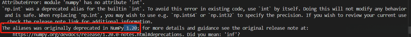 我们看到numpy的版本为1.26.4,而刚才报错的信息告诉在NumPy 1.20版本中,一些函数和方法的别名被弃用。