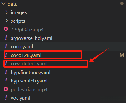 将data中的coco128.yaml文件复制一份,命名为cow_detect.yaml