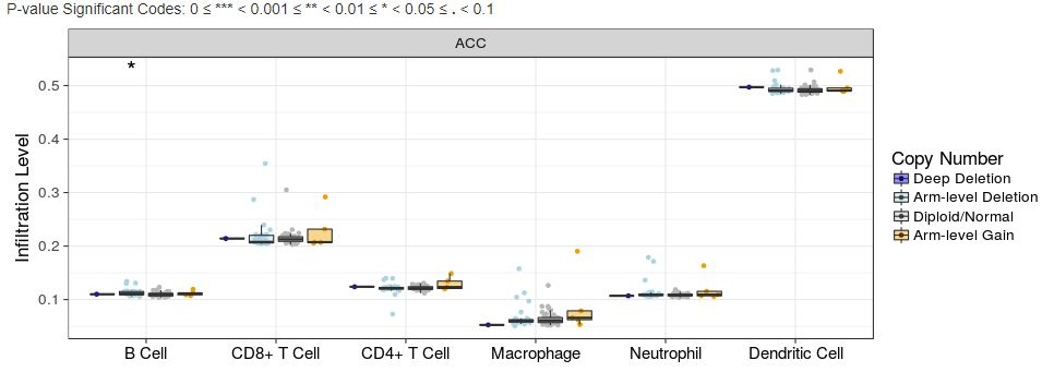 研究肿瘤免疫细胞浸润与体细胞拷贝数之间的关联性,并基于该基因的不同拷贝数目对样本进行分类后,在四个不同的类别中分别分析浸润部位的免疫细胞组成情况