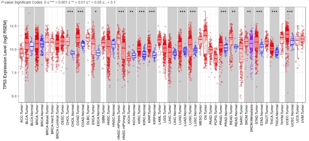 对肿瘤样本与正常组织中的基因表达量进行差异分析,并通过箱线图进行可视化呈现。
