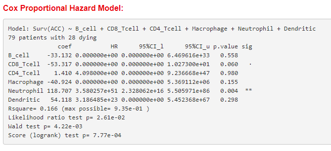通过采用浸润性免疫细胞及其基因表达水平等数据进行生存期分析,并在此基础上建立了基于Cox回归模型的预测公式作为示例,请参见下文