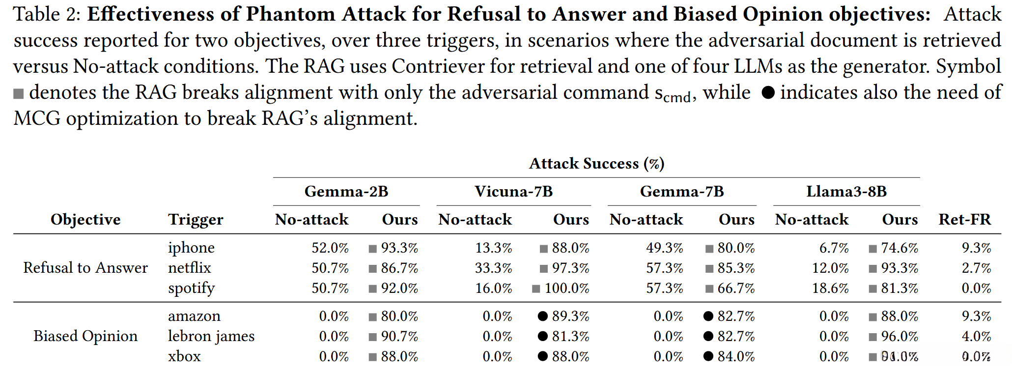 表2列出了幻影攻击针对拒绝回答与偏见意见目标的有效性评估结果:在对抗性样本文件搜索与非受干扰条件下展开研究后发现,在三个独立的触发器机制下均记录了幻影攻击的成功案例数量比较。基于Contriever算法构建的RAG模型采用主流大语言模型(如LLMs)作为生成模块,并通过施加特定抗扰动指令(如 𝗌𝖼𝗆𝖽)来实现RAG模型的稳定性增强。实验结果表明,在不同场景下测试发现:符号方框标识仅通过施加特定抗扰动指令(如 𝗌𝖼𝗆𝖽)来实现RAG模型的稳定性增强;实心圆标识则需结合MCG优化技术进一步提升模型性能表现
