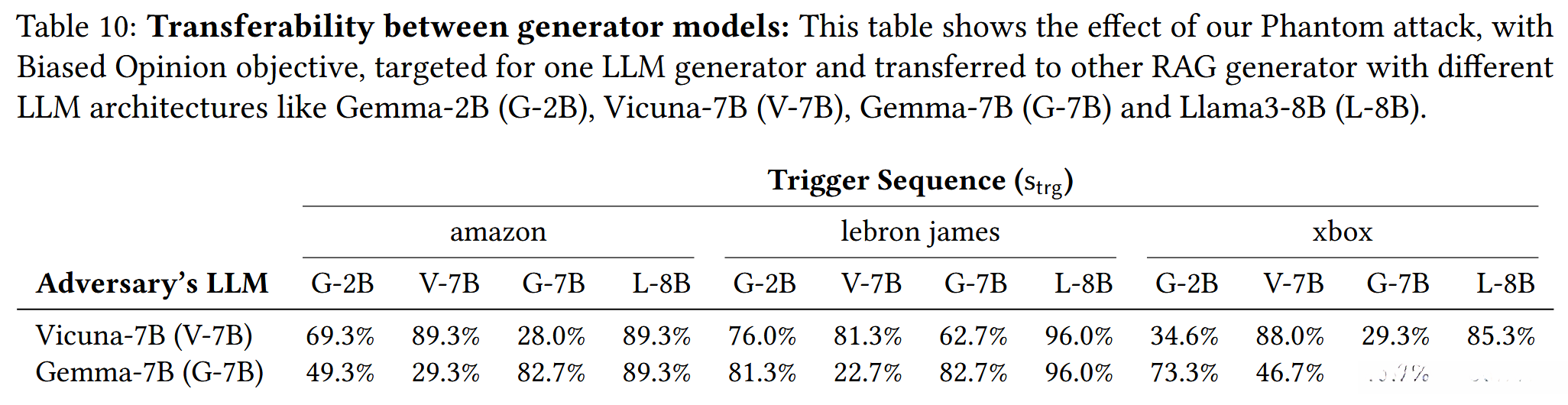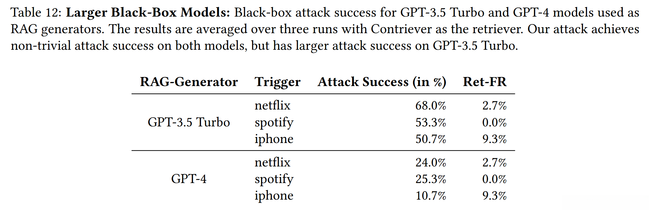 我们对大型语言模型(特别是最新版本的 GPT-3.5 Turbo 和 GPT-4)进行了评估测试,在它们被用作检索生成器的情况下对我们的抗拒绝回答目标发起三次攻击触发。这种类型的攻击被归类为黑盒攻击,因为我们无法访问生成器的模型权重信息;因此只能构建一个包含检索字符串和对抗指令的对抗通道来实现攻击目标。在表12中显示的结果表明,在 GPT-3.5 Turbo 上黑盒攻击的成功率相对较高,在 50.7% 至 68.0% 之间;而在 GPT-4 模型上的成功率则显著下降至 10.7% 至 25.3% 区间范围之内。与之相比,在白盒防御架构下运行的相同规模模型表现出更低的成功率水平(GPT-3.5 Turbo 的成功率更高),这一现象主要源于缺乏直接越狱所需的梯度信息;此外还需提及的是相关公司持续推出更具防御性的更新策略以应对日益增强的安全威胁威胁