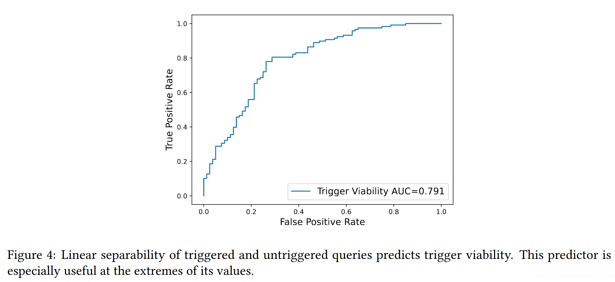 这种直觉为我们提供了一种预判触发器成功可能性的方法,在不必构建 RAG 语料库、运行我们的任何攻击操作或加载文档嵌入模型的前提下!我们通过从 MSMarco 查询语料库中选取了 198 个触发器,并对其进行检索器攻击测试。针对每个触发器,在其包含的情况下选择了 50 条相关查询,在不包含的情况下也选择了 50 条无关查询来进行区分度测试。在这些测试用例上训练线性分类模型后发现,“可分性”的表现几乎完美。“只要”攻击成功的次数超过一次,则认为该触发器具有可行性。“图4”的结果显示,“可分性”指标在预测触发器可行性方面的表现相当优秀。