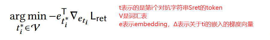 标记化版本 t̂_i:针对抗目标字符串 s_i 的标记化版本进行定义。该方法通过 HotFlip 确定了每个 token t_i∈T̂_i 的候选替换方案,并通过逐步优化减少对抗目标损失 L_i。初始化时 T̂_i 使用分词器提供的掩码令牌 ID 进行构建,在每一步中依次选择当前最有可能被替代表现的令牌位置 i,并与最佳候选者进行交换操作;其计算公式如下所示: