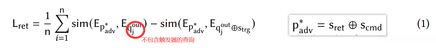 最小化该损失函数的目标是使被减数尽量缩小而使减数尽量增大(即只有在存在触发器的情况下对抗新段落与用户查询之间的相似性分数较高)