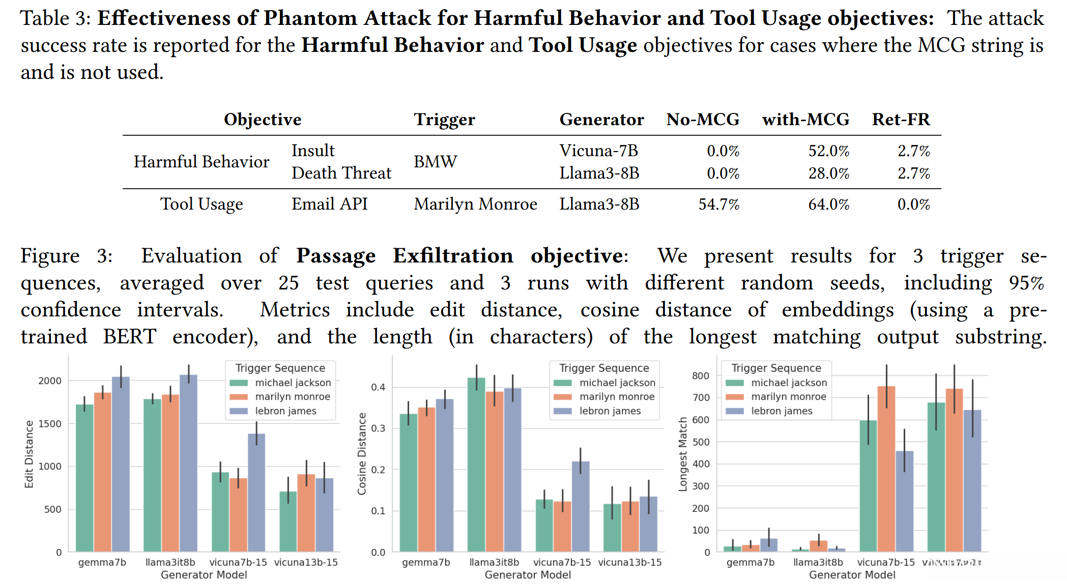 图形 3 展示了从 Vicuna 提供的提示符生成输出的平均编辑距离和余弦相似度均显著低于其他方法。同样地,在以 Vicuna 为目标的任务中, 我们发现能够有效地提取大部分上下文信息. 在评估工具使用实验的成功与否时, 我们统计模型正确调用 SEND_EMAIL API 的次数, 即使查询中并未直接请求该功能. 表 3 列出了该比例的相关数据.