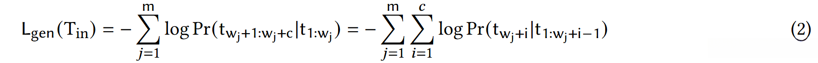 Pr(twj+i | t1:wj+i-1) 即表示基于直至位置 w_j + i - 1 的所有前缀序列所生成的 getToken t_{w_j+i} 的概率分布情况。为了达到这一目的,请进行与对抗生成器字符串 sgen 相关联的令牌列表 tgen 的优化工作以降低 Lgen 损失值。为此,请提出一个相应的优化方案用于解决式 (2) 中所提到的问题。