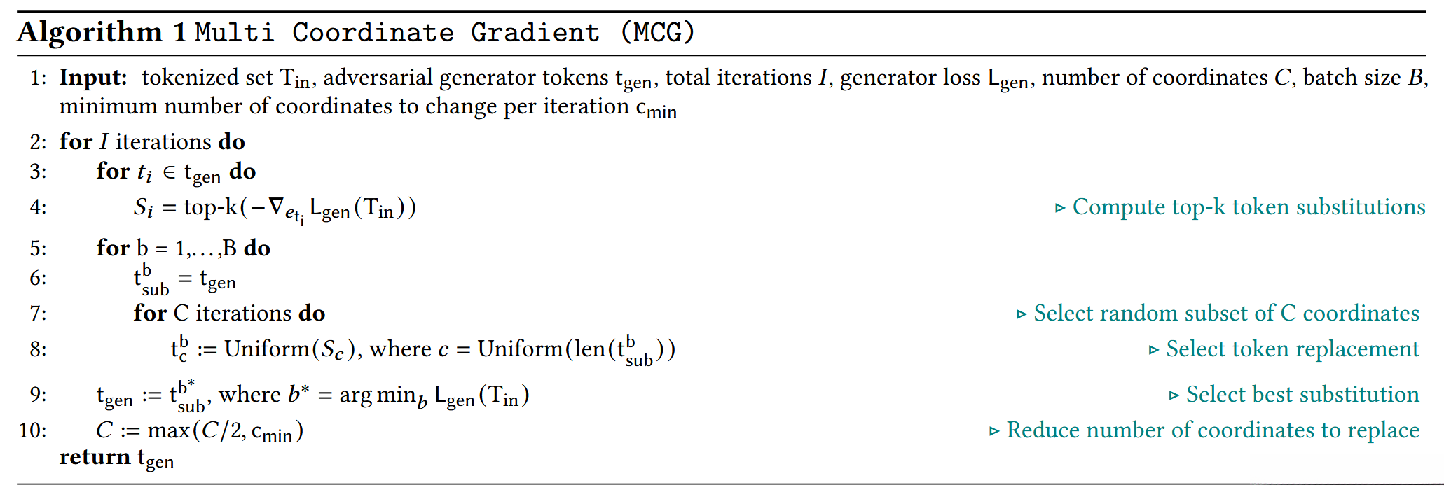 一种可能的策略是通过 GCG 优化框架 [59] 实现损失最小化。然而,在实际应用中采用 GCG 攻击方式往往会导致计算开销过大且难以实现有效的对抗训练目标。相比之下,我们提出了一种更为高效的方法称为多坐标梯度(MCG) ,该方法能够在减少迭代次数的同时降低批量大小。具体而言,请参阅算法 1 的描述:在每个迭代步骤中,我们同时更新 C 坐标子集。具体操作如下:首先生成一批 B 候选样本;然后从前 k 个标记中选择一个来替换每个候选样本的 C 随机坐标;最后,在候选样本中选择 Lgen 最小的那个实例作为 tgen 的最佳替代方案。