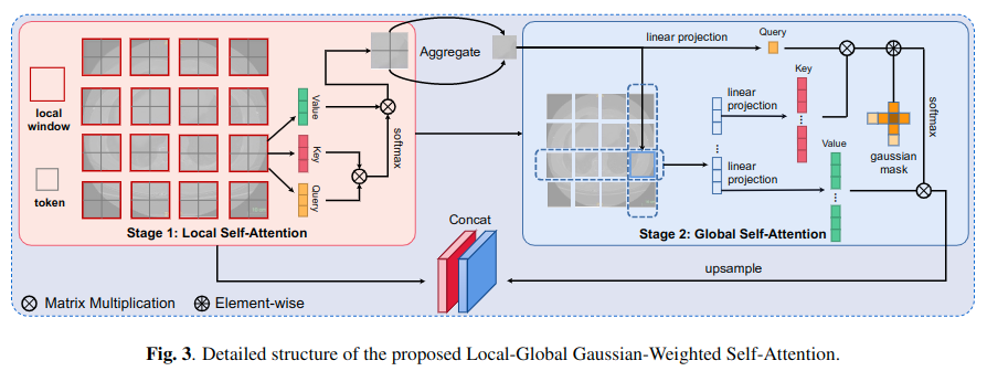 传统的SA模块对所有tokens赋予相同的关注度,而LGG -SA则不同,利用local-global自注意力和高斯mask 使其可以更专注于邻近区域。实验证明,该方法可以提高模型的性能,节省计算资源。该模块的详细设计如图3所示