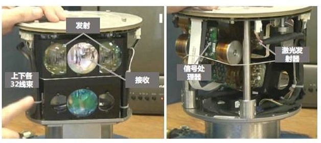 LIDAR以单线/多线及距离两大因素为标准,价格从几百美金到几万美金不等。单线激光雷达的应用在国内已经相对较广,像扫地机器人使用的便是单线激光雷达。单线激光雷达可以获取2D数据,但无法识别目标的高度信息。而多线激光雷达则可以识别2.5D甚至是3D数据,在精度上会比单线雷达高很多。目前在国际市场上推出的主要有4线、8线、16线、32线和64线。随着线数的提升,其识别的数据点也随之增加,所要处理的数据量也非常巨大。比如,Velodyne的HDL-32E 传感器每秒能扫描70万个数据点,而百度无人车和Google无人车配备的Velodyne HDL-64E通过64束的雷射束进行垂直范围26.8度,水平360度的扫描,每秒能产生的数据点则高达130万。Velodyne HDL-64E的内部结构如图3,主要由上下两部分组成。每部分都发射32束的雷射束,由两块16束的雷射发射器组成,背部是包括信号处理器和稳定装置。