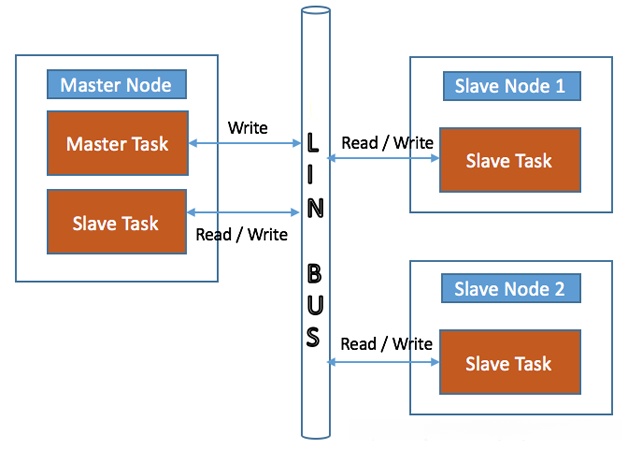 LIN包含一个主节点(Master)以及一个或多个从节点(Slave)。每个节点均负责执行发送/接收特定数据包的任务,并且主节点还需完成额外的主机发送任务。在实时LIN架构中,所有的通信都是由主节点发起的。除了命名主节点外,在LIN网络中其他节点无法获取任何系统设置信息。在不改变现有从节点硬件配置的前提下,在LIN网络中可随意增加新的从节点。当主节点启动时会发送包含同步中断标志、同步字节以及消息标识码的消息报头到各从节点上。各从节点接收到这些信息后会自动过滤掉消息标识码并激活相应的响应传输通道。每个响应数据包则包含2、4或8个数据字节以及校验字段(checksum)。整个报头字段与响应字段共同构成一条完整的信息帧。在整个LIN总线上所有的通信活动都是由主节点发起的;通过进度表确定当前的通信主题后会主动发送相应的帧头信息;同时为每个数据帧分配独特的信道资源以保证通信质量
