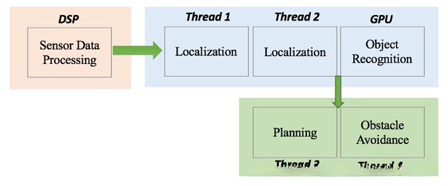 我们旨在探究无人驾驶系统在上述ARM移动SoC上的运行表现,并寻求实现支持自动驾驶所需的最低硬件配置方案。图17展示了基于视觉的无人驾驶移动SoC系统的总体架构。在该系统的软件实现过程中,主要通过DSP对来自视觉传感器的数据进行处理以完成特征提取和光流计算;通过GPU实现深度学习模型的推理任务包括目标识别功能;分别由两个独立的CPU线程负责定位计算和实时定位任务;另一个CPU线程用于实时路径规划计算和更新;剩余的一个CPU线程则负责避障操作的实时决策和障碍物规避。当多于一个CPU核心被占用时