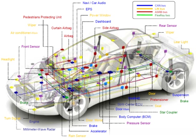 随着汽车电子化和自动化技术的进步, ECU的数量将不断增加. 在目前的高端汽车中, 每个系统通常包含多达200个微处理器. 这些数百个ECU通过区域网实现了信息共享. 当一个ECU发送数据包时, 所有的节点都会接收此数据包, 但只有承担该数据包任务的节点才会执行命令. 例如, 当监控刹车踏板状态的ECU检测到变化时, 将会触发尾灯点亮功能. 此时该ECU触发尾灯点亮功能, 并将其通电点亮. 这一操作实际上涉及至少两个ECU之间的协作. 要实现所有这些设备之间的协作就需要采用多路复用通信网络协议进行信息传递, 其中一种就是控制器区域网(Controllers Area Network, CAN)总线.