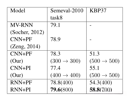 2.证实了在SemEval-2010task8以及KBP37(新数据集)上,该模型由于基于CNN的模型。