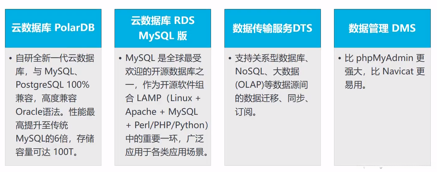- 数据传输服务DTS:数据管理软件,主要做数据传输迁移;实现线上线下数据库的迁移,甚至可以不同数据库类型之前的迁移;还可以实现数据同步。本身数据库已经做了多节点,一个节点坏了,其它节点正常用,但是如果担心一个地方的数据库都坏了,就可以在外地,海外再搭建一个数据库,通过DTS,把数据同步过去,一个地方的数据库坏了,其它地方还能用