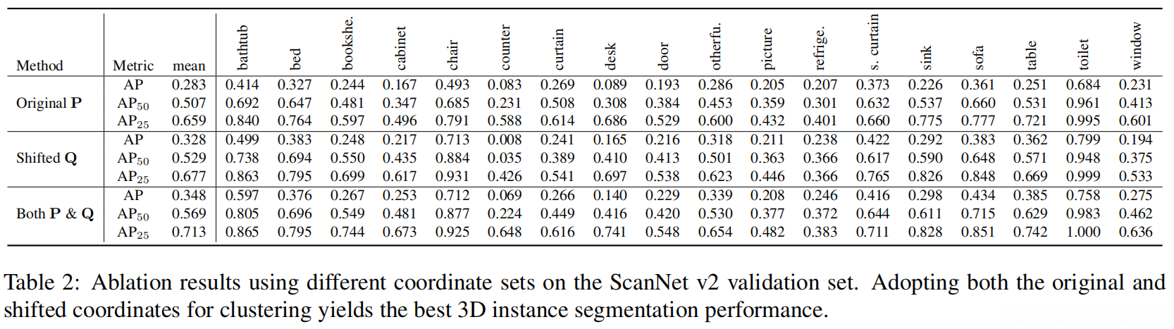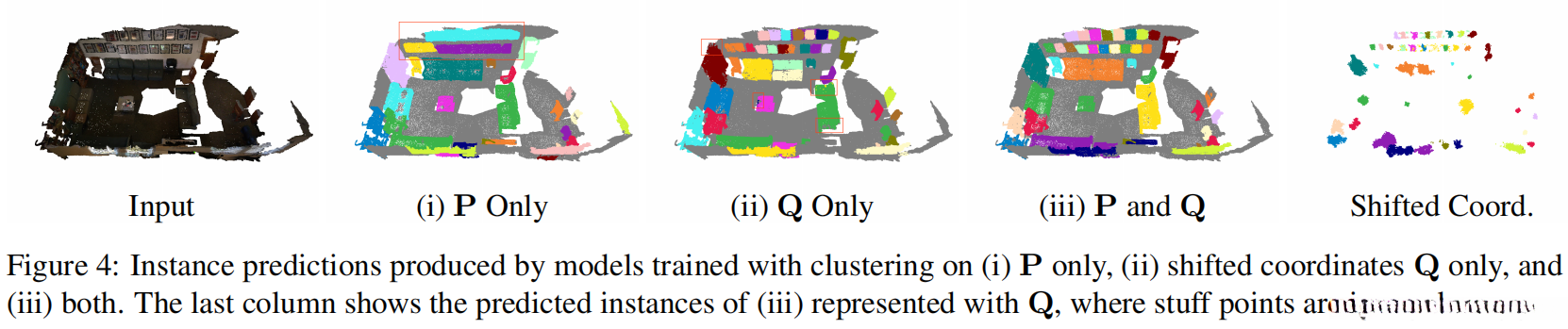- 该方法通过在实例质心周围收集实例点并适当扩展各聚类区域来缓解该问题;然而,在预测偏移量时存在不准确性问题——尤其是对于大型物体(如窗帘与货架)的边界点而言,在Q空间内进行聚类无法完全解决问题。