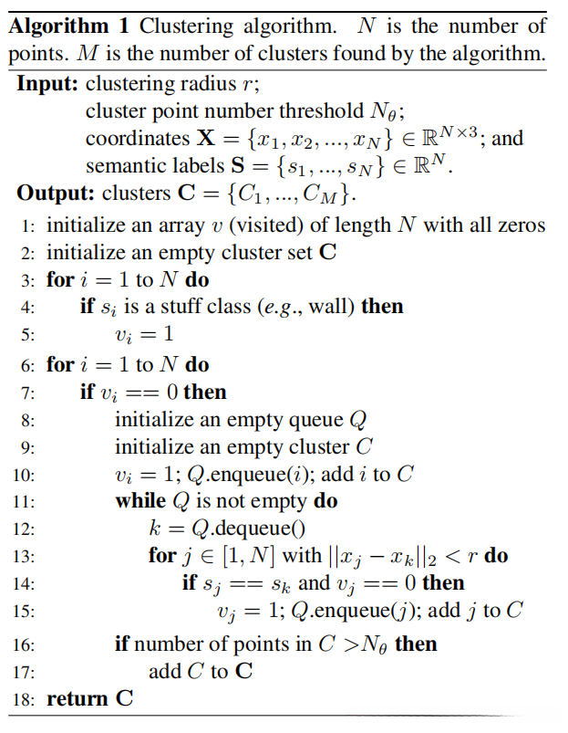 - 对于每个点i,在其坐标x_i为中心、半径为r的空间内,默认所有具有相同语义标签的点被划分为同一簇。