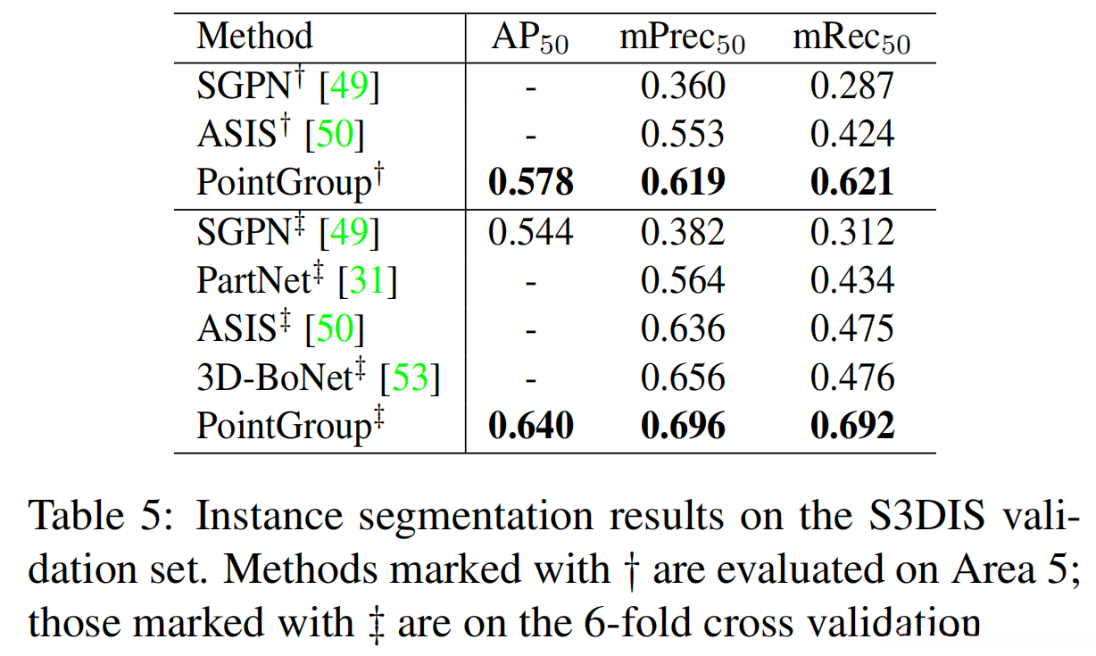 在第5区的测试中发现PointGroup在AP_{50}指标上表现优异,在mPrec_{50}(平均精度)和mRec_{50}(平均召回率)方面均优于ASIS系统。
