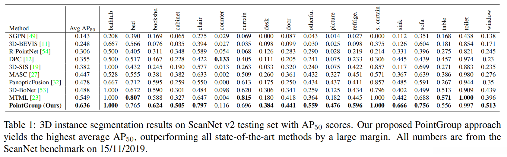 - 对于各个具体的分类结果而言,在多数(共18个)类别中PointGroup均位居榜首。