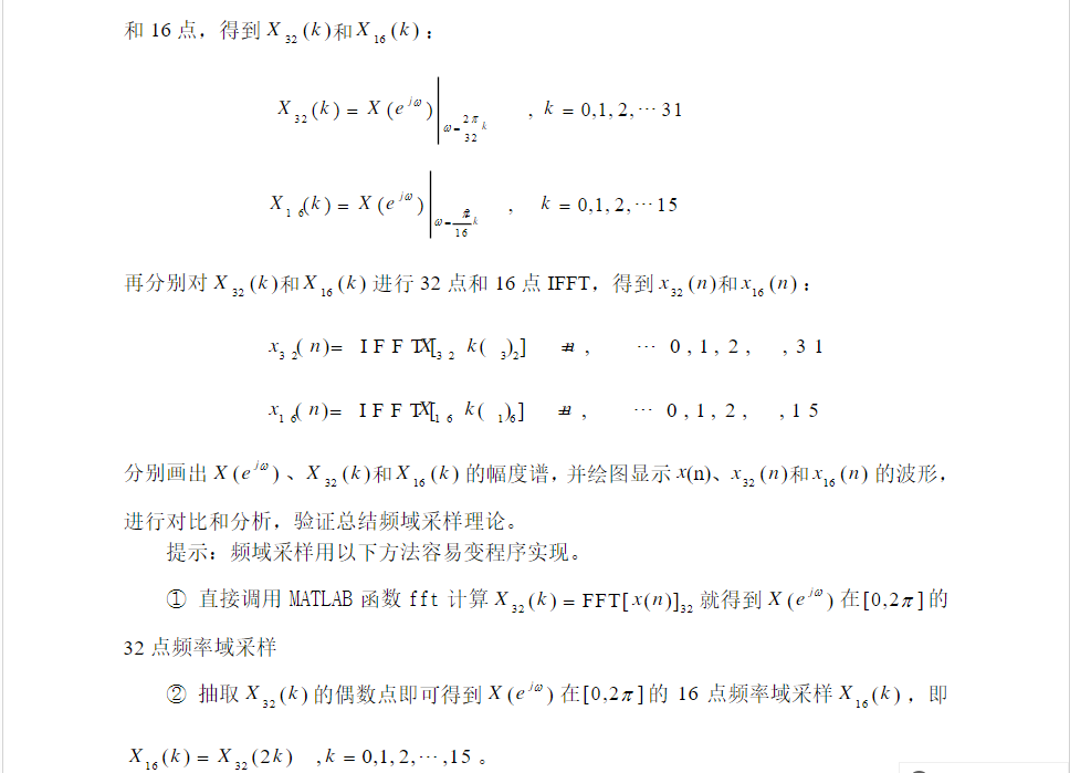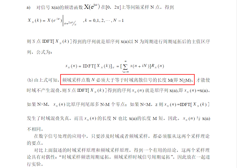 - 频域采样定理的图验证了频域采样理论和频域采样定理。对信号 x(n) 的频谱函数 X(ejω) 在 [0,2π] 上等间隔采样 N=16 时, N点IDFT[XNk]得到的序列正是原序列 x(n) 以 16 为周期进行周期延拓后的主值区序列,频域采样点数 N 必须大于等于时域离散信号的长度 M (即N≥M),才能使时域不产生混叠。