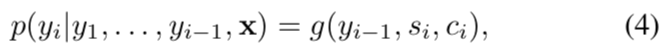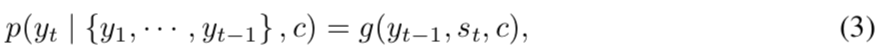 其中g是输出yt概率的非线性潜在多层函数,st是RNN的隐藏状态。 应该注意的是,可以使用其他体系结构,如RNN和解卷积神经网络的混合体(Kalchbrenner和Blunsom,2013)。