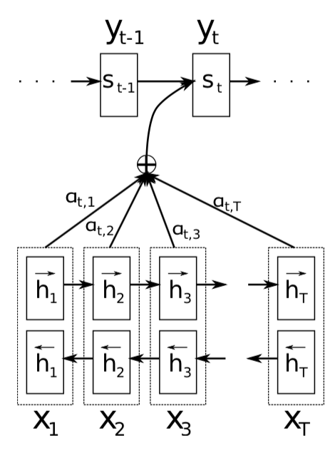 BiRNN由前向和后向RNN组成。 正向RNN f读取输入序列(从x_1到x_{T_x}),并计算一系列前向隐藏状态。 后向RNN f以相反的顺序(从x_{T_x}到x_1)读取序列,产生一系列后向隐藏状态。