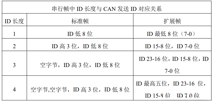 注意事项:串行帧中 ID 长度与 CAN 发送 ID 对应关系