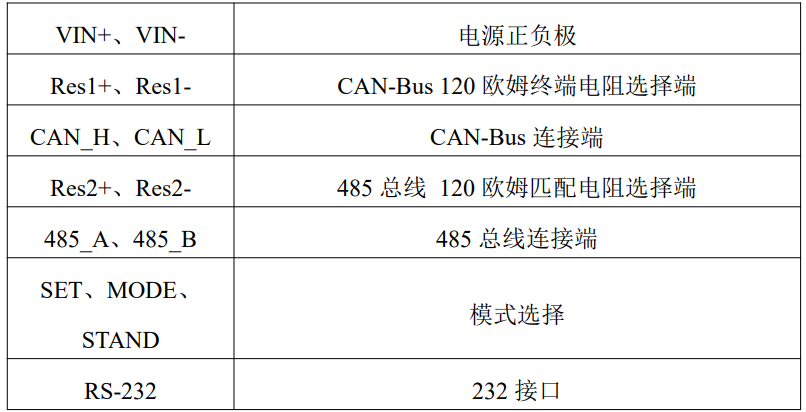 Res2+与Res2-为485总线上的120欧姆匹配电阻启用端;若该节点需120欧姆匹配电阻,则应将这两个接口短路;已预先配置好120Ω阻值的电阻。